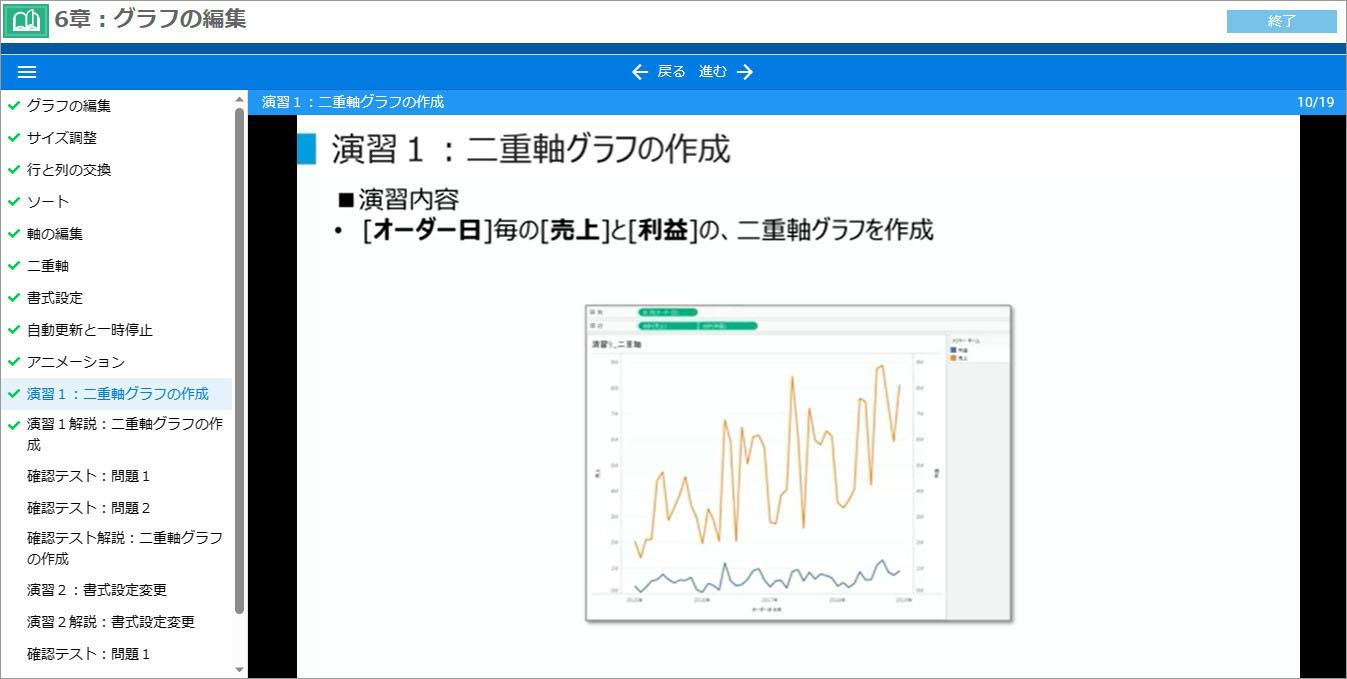 演習課題の模範操作を講師が動画上で実演します。講師の手順通りにTableau Desktopを操作することで理解が深まります。