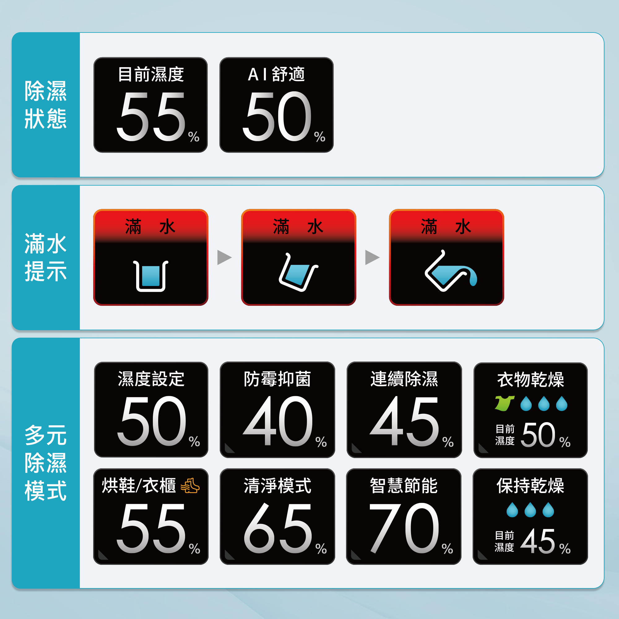 ■ 除濕狀態:即時顯示目前濕度及設定模式。