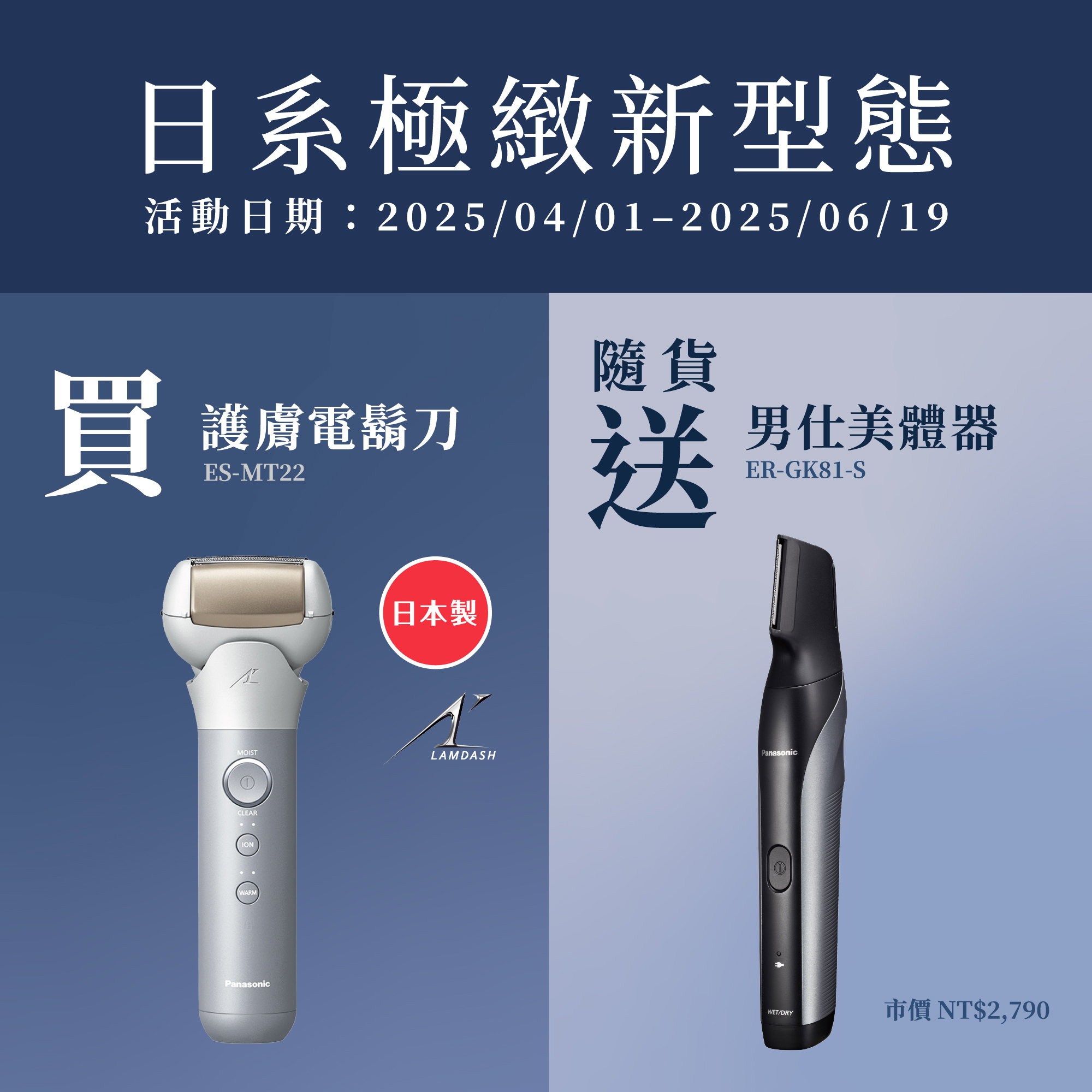![[日系旗艦 質感魅力] 2025/10/01~2026/2/26 買護膚3枚刃ES-MT22,就送男仕美體器ER-GK81-S](/content/dam/Panasonic/tw/zh/Promotion-Panel/2025/ES-MT22.png)