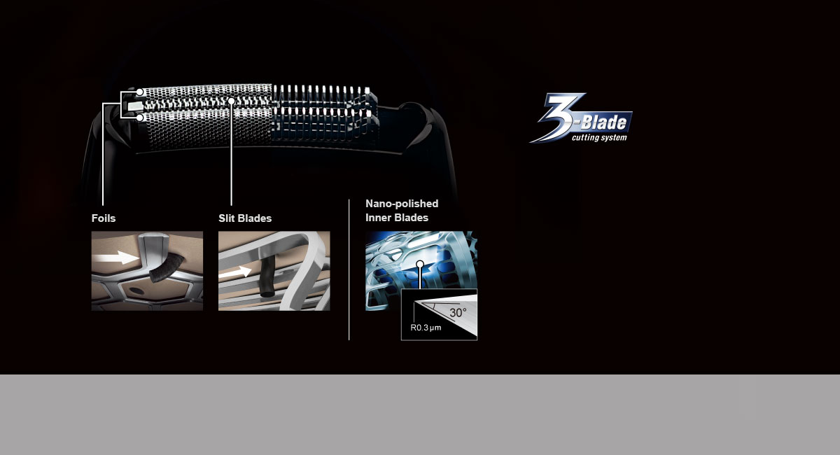Three blades shorten whiskers and cut close to the roots