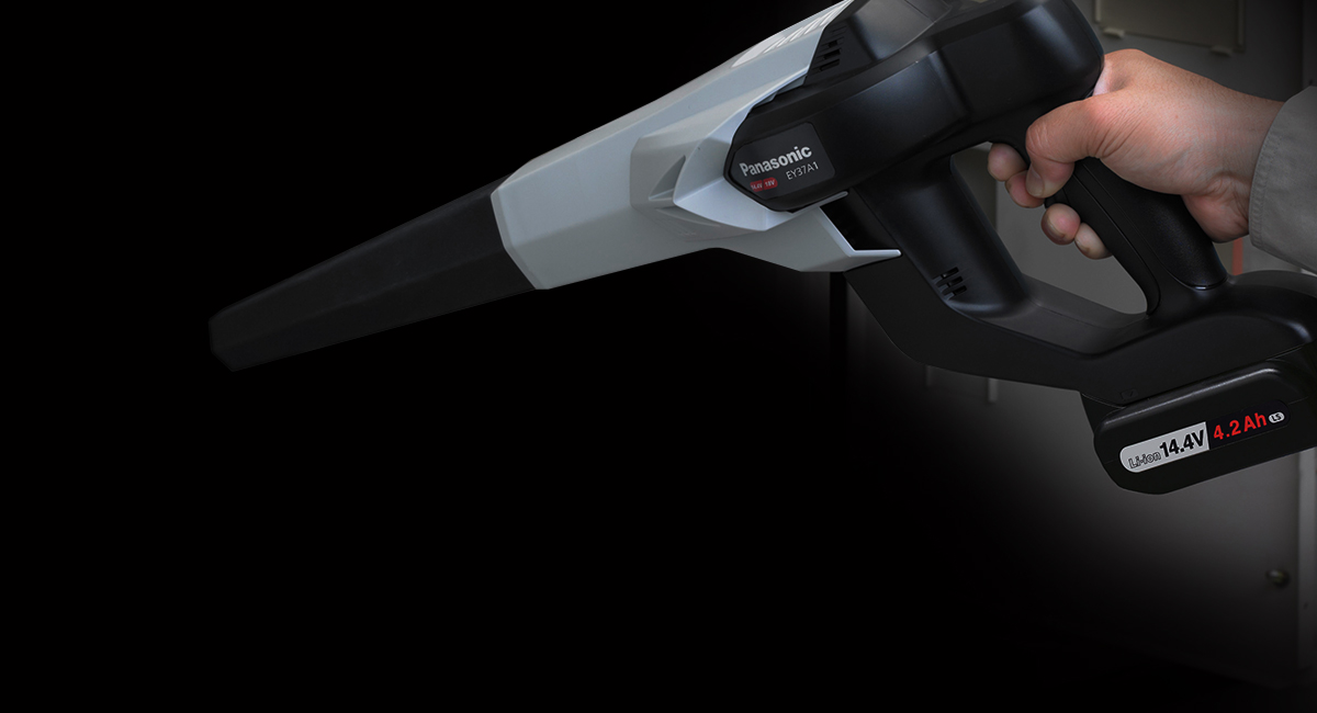 The Panasonic EY37A1B57 Dual Voltage Cordless Blower features high wind speed and powerful air volume with variable air volume control making work quicker and easier. The blower accepts either the Panasonic 14.4V or a 18V Li-ion battery pack.