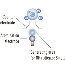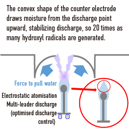 The convex shape of the counter electrode draws moisture from the discharge point upward, stabilizing discharge, so 20 times as many hydroxyl radicals are generated. Electrostatic atomisation Multi-leader discharge (optimised discharge control) |