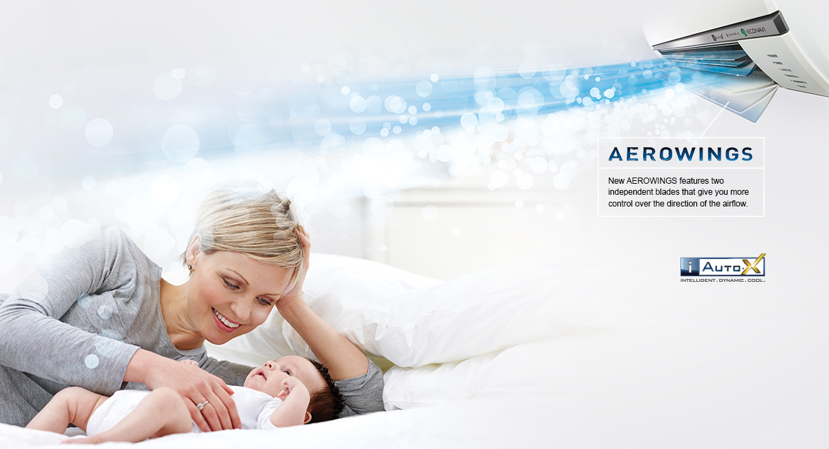 WITH AEROWINGS After reaching a set temperature, the AEROWINGS twin blades direct air towards the ceiling to create the Shower Cooling effect. Then, the Human Activity Sensor detects the level of activity and adjusts the temperature to keep you comfortable.