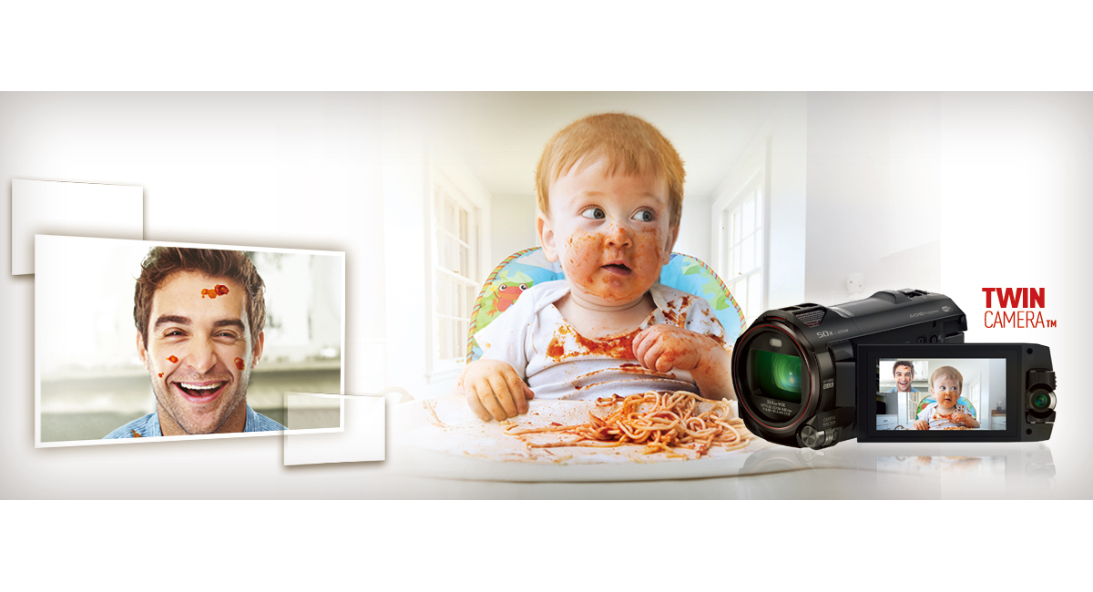 The Twin Camera records two scenes at the same time and doubles your fun. Record your precious memories with the premium picture quality from the world's first* 4-Drive Lens System and improved Level Shot Function.
