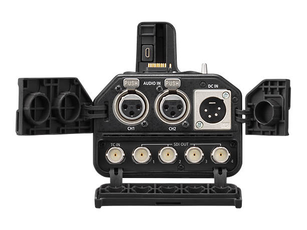 L'unité d'interface est proposée exclusivement pour les workflows professionnels et industriels afin de permettre une transmission vidéo plus puissante. Elle est compatible avec la sortie 4 flux parallèles Full HD (4:2:2/10 bits) ou la sortie 4K (4:2:2/10 bits), toutes deux avec Time code*. Les bornes d'entrée XLR 2 ch sont également équipées pour les microphones linéaires ou à condensateur. Le volume du microphone peut être réglé séparément pour les sorties gauche et droite. L'interface est compatible avec l'entrée 12 V CC.