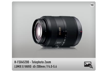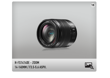 Profitez d’une vue à 360° du LUMIX G6 « Plus rapide, plus rapproché, plus intelligent ». Il suffit de cliquer sur l’appareil photo et d’utiliser votre souris pour naviguer tout autour, et d’utiliser la barre de zoom à droite pour avoir une vue rapprochée. Il est également possible de modifier la couleur de l’appareil photo et de changer d’objectif à l’aide d’un simple clic de souris.