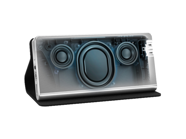 L’enceinte est dotée de deux haut-parleurs à l’avant reproduisant un son naturellement clair. La compatibilité avec les codecs audio de haute qualité aptX et Bluetooth Re-master offre un son pur et net.