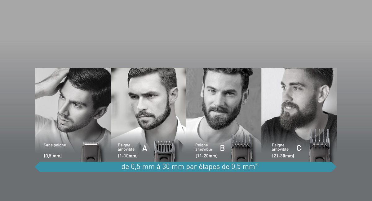 Vous avez le choix parmi trois peignes qui vous permettent d'ajuster la longueur de coupe de 0,5 à 30 mm en 58 étapes de 0,5 mm.