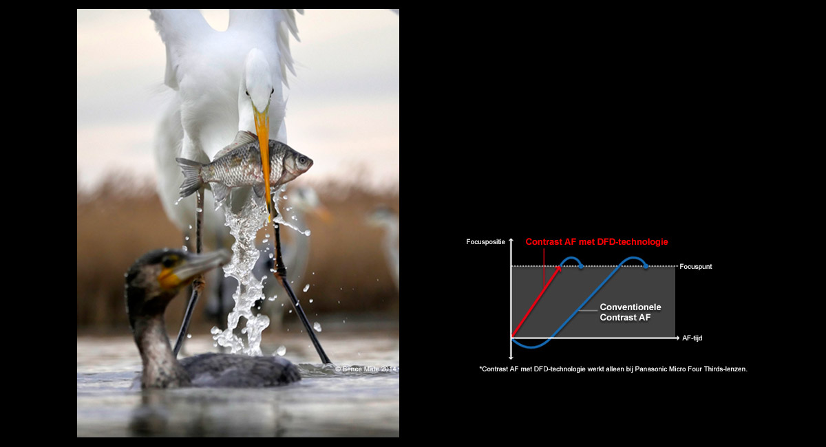 Het Contrast-AF-systeem is uitgebreid met DFD-technologie (Depth from defocus), waardoor de focustijd nog korter wordt. Deze technologie berekent in een oogwenk de afstand tot het onderwerp door twee beelden met verschillende scherpteniveaus te vergelijken op basis van de optische karakteristieken van de huidige lens. Het resultaat is een ultrasnelle AF van circa 0,07 seconde*. Deze verbetering is nog effectiever naarmate de brandpuntsafstand toeneemt.