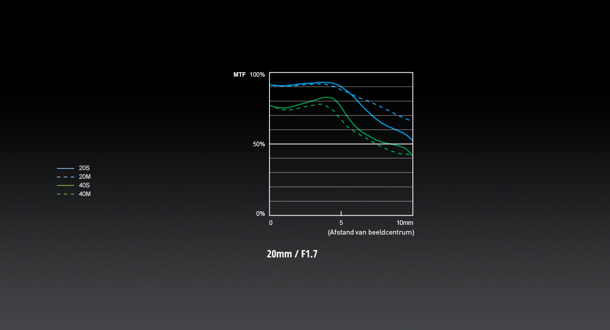 Voor lenzen die vervorming compenseren geeft de horizontale as van de MTF de afstand vanaf het centrum van het gecorrigeerde beeld aan.