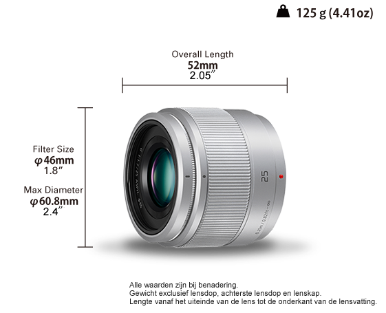 Geef je foto's een mooi scherptediepte-effect voor indrukwekkende, creatieve opnamen. Deze snelle F1.7 lens maakt het mogelijk. In combinatie met de 25 mm scherpstelafstand (vergelijkbaar met een 35 mm camera: 50 mm), vergelijkbaar met dezelfde kijkhoek en het gevoel van perspectief als het menselijk oog, is deze lens ideaal voor zowel portretten en landschappen zoals je ze graag wilt laten zien - met een duidelijk onderwerp en een uitstekende kleurweergave.
