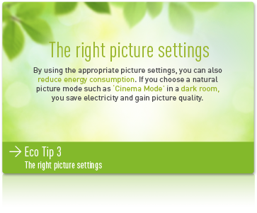 Door de beeldinstellingen van uw TV aan te passen aan uw eigen voorkeur en op basis van de plek waar de TV staat, zoals het omgevingslicht, kunt u zowel de beeldkwaliteit aanzienlijk verbeteren als energie besparen. De standaardinstellingen voor beeldhelderheid in ruimtes met weinig omgevingslicht zijn absoluut te hoog; er wordt onnodig veel stroom verbruikt. Daarom heeft Panasonic de nieuwste VIERA-modellen voorzien van een lichtsensor. Deze sensor verlaagt automatisch de helderheid van de TV als u in een donkere ruimte zit te kijken. De TV past zich helemaal uit zichzelf aan de verlichting aan, zelfs aan de hoeveelheid daglicht. Hierdoor wordt energie bespaard en dat is goed voor het milieu.