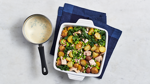 Once steamed, cut potatoes into quarters and mix with tuna, kale, celery and peas. Place the mixture in an 8x8 casserole dish and pour the sauce evenly over the top.