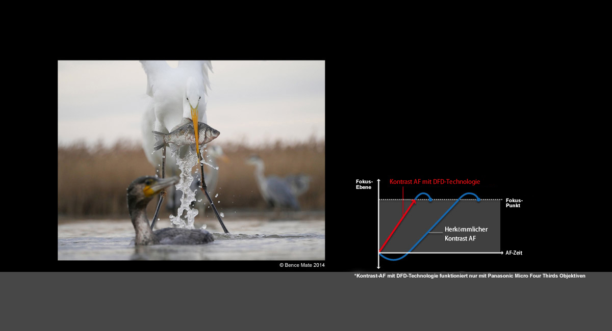Hervorragende Mobilität und extrem schnelle Reaktionszeiten gehören bei der GH4 zur Grundausstattung. Der hochpräzise Kontrast AF ist mit der neuen DFD-Technologie (Depth From Defocus) ausgestattet, die einen ultraschnellen Autofokus in nur 0,07 Sekunden ermöglicht*. Die Serienbild-Aufnahmegeschwindigkeit wurde zugleich auf volle 12 B/s (AFS) gesteigert. Die GH4 besitzt einen 2.359.000-Pixel-OLED-Sucher (Live View Finder), sowie ein 1.036.000-Pixel-OLED-Display, beide bieten neben verbesserter Auflösung auch eine schnellere Bildwiederholrate.