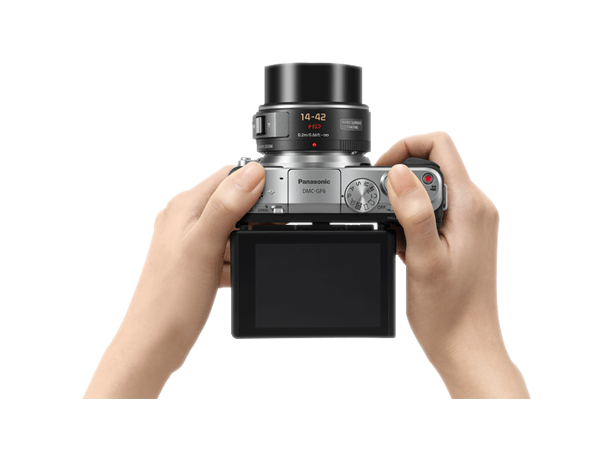Trotz ihrer schlanken, kompakten Bauweise ist die DMC-GF6 mit einem integrierten Blitz sowie einem grossen, um 180° nach oben und 45° nach unten schwenkbaren LCD-Monitor bei 7,5 cm Diagonale ausgestattet. Ein Funktionshebel am Auslöser und das Moduswahlrad erlauben den unkomplizierten Aufruf wichtiger Funktionen.