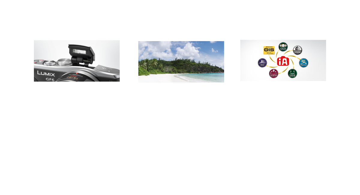 Als wahres Raumwunder erweist sich die GF6. Trotz ultraschlankem Design verfügt die kleine Kamera nicht nur über ein grosses LC-Display mit komfortabler Touchfunktion und ein Moduswahlrad, welches den direkten Zugriff auf wichtige Aufnahmefunktionen ohne den Umweg über das Menü erlaubt, sie beherbergt auch noch einen individuell ausklappbaren Blitz. Der erscheint immer im richtigen Augenblick, nämlich wenn Sie es wollen, und macht Platz für Ihre kreativen Aufnahmen.