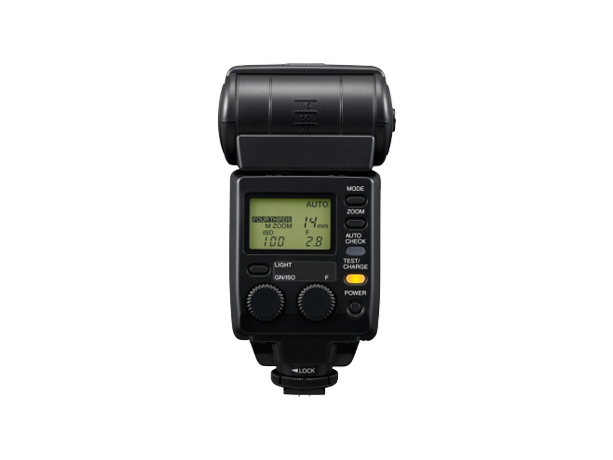 Externes Blitzlicht. TTL-Steuerungsmöglichkeit. Stromversorgung über eigene AA-Batterien (optional). Leitzahl 50, vertikal und horizontal schwenkbarer Reflektor, FP fähig.