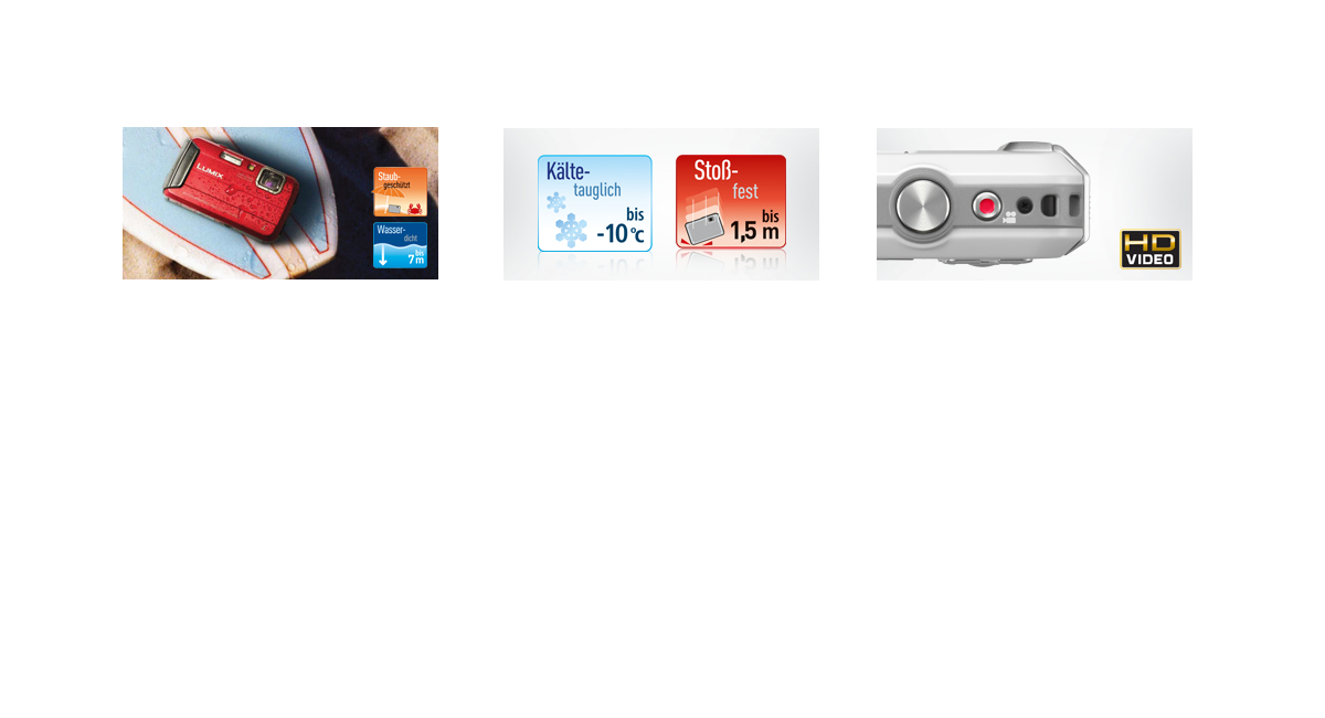 Die 16,1-Megapixel-Kamera hält mit ihrem Leica DC Vario-Objektiv [KB: 25-100 mm] alle Familienabenteuer fest und glänzt durch ihre robusten Outdoor-Fähigkeiten: Sie ist staubdicht, wasserdicht bis 7m Tauchtiefe, stossfest bis 1,5m Fallhöhe und frostsicher bis -10°C.
