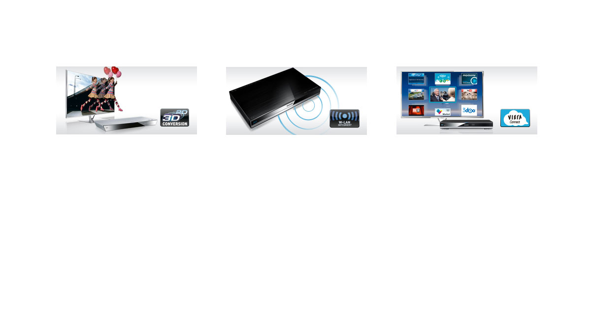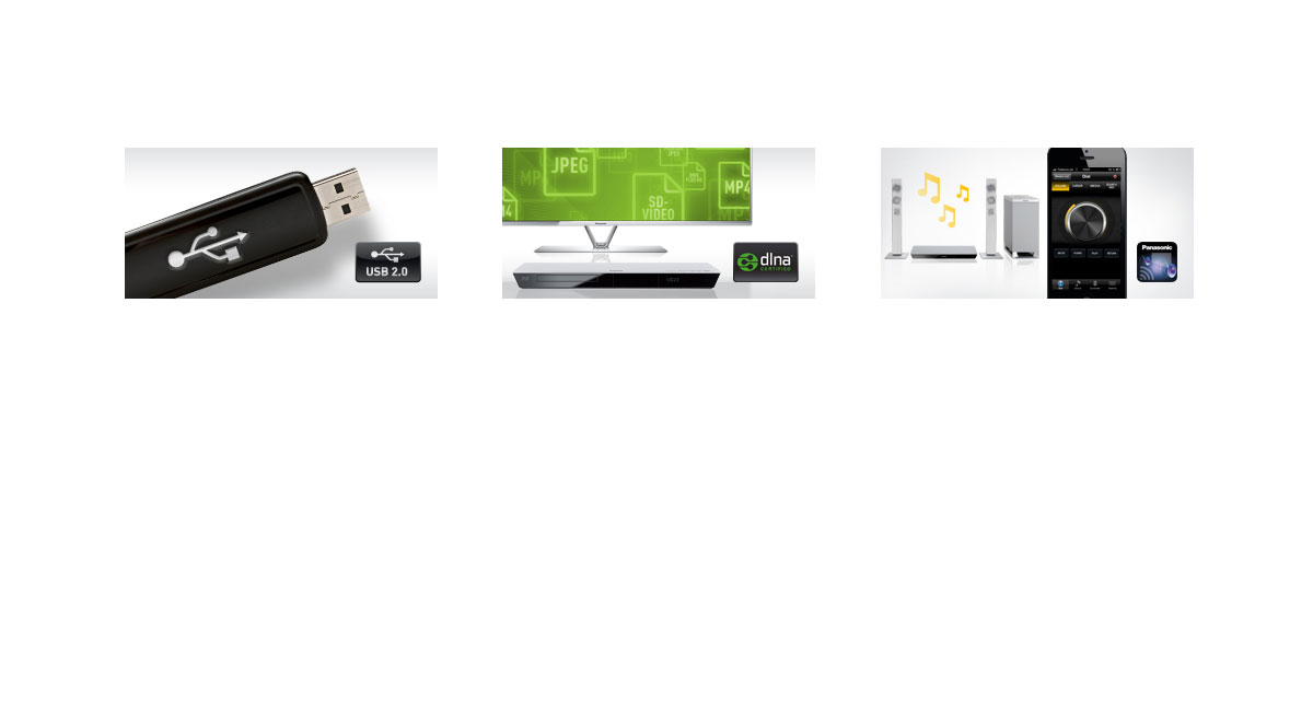 Bei den meisten Panasonic Blu-ray Playern und Recordern ist W-LAN bereits integriert. Das macht es Ihnen leicht, Ihr Heimkino Produkt zu vernetzten – mit dem Internet und zuhause mit anderen DLNA-zertifizierten Geräten. Ganz ohne Kabelsalat und Stolperfallen.