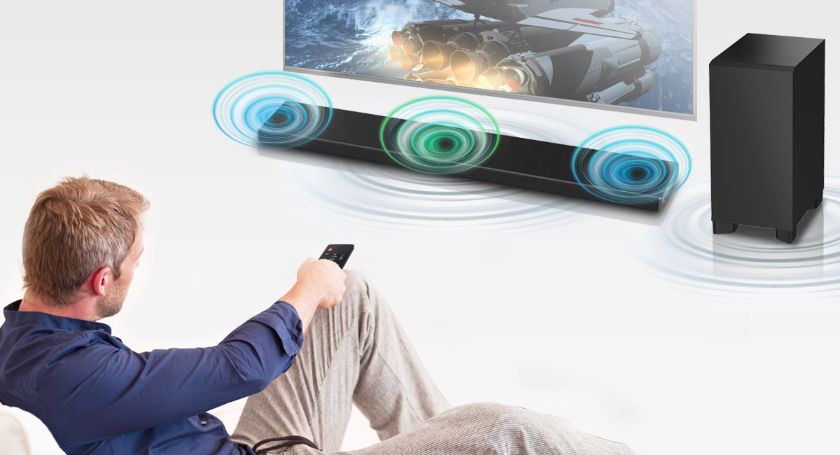 Dreikanalige Lautsprecher mit kabellosem, in das Gehäuse integriertem Tieftöner bilden ein 3.1-kanaliges Surround-System wie im Theater. Dabei ist kein extra Platz nötig, damit Sie Filme und andere Bildinhalte in lebensechtem Akustik-Ambiente geniessen können.