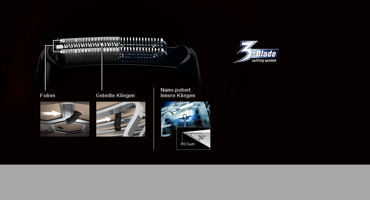 Drei Klingen kürzen die Barthaare und schneiden diese direkt an der Wurzel ab für eine glatte Rasur. Die Klingen erfüllen zwei unterschiedliche Aufgaben für eine schnelle und gründliche Rasur. Die nano-polierten inneren Klingen im 30°-Winkel garantieren zudem eine unglaublich glatte Rasur.