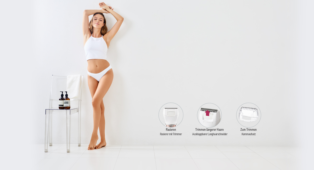 Bringen Sie den Kammaufsatz einfach am Rasieraufsatz an und klappen Sie den Langhaarschneider aus. Dieser ermöglicht eine schnelle Vorrasur als Vorbereitung auf die Epilation sowie ein gezieltes Trimmen.