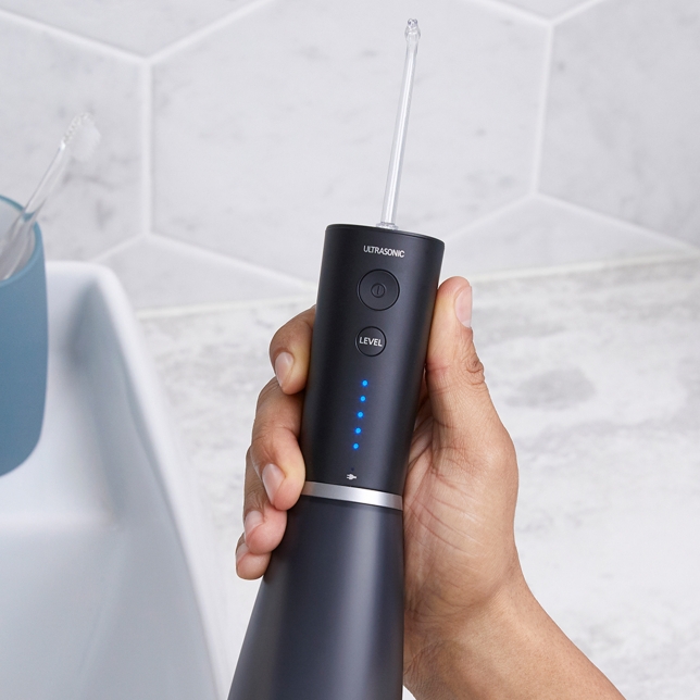 Mit dem leistungsstarken Ultraschall-Wasserstrahl gelangen Sie mühelos zwischen die Zähne, um Speisereste zu entfernen.