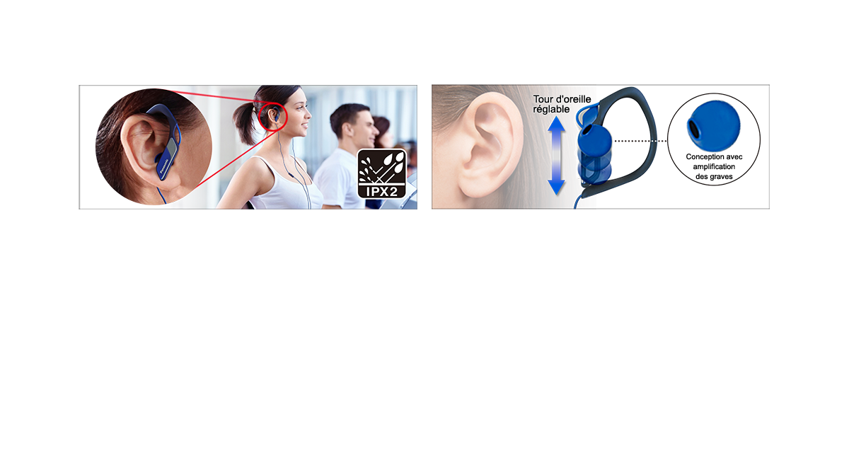 Le design résistant à l'humidité (équivalent à l'indice IPX2) protège de la sueur et le tour d'oreille réglable offre à ces écouteurs clip un maximum de confort même lors de vos entraînements sportifs. Les graves sont clairs et puissants.