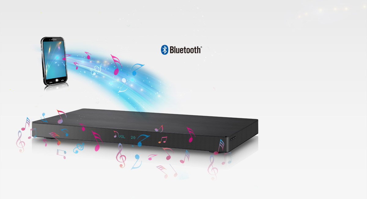 La barre de son HTE180 s'insère sous votre téléviseur. Son châssis compact intègre deux haut-parleurs avant, deux subwoofers et deux ports Aero Stream pour des graves nets et puissants. Cet appareil est également compatible avec les technologies Bluetooth® et NFC. En plus de regarder vos films, vous pouvez écouter la musique de votre smartphone avec un son réellement dynamique.