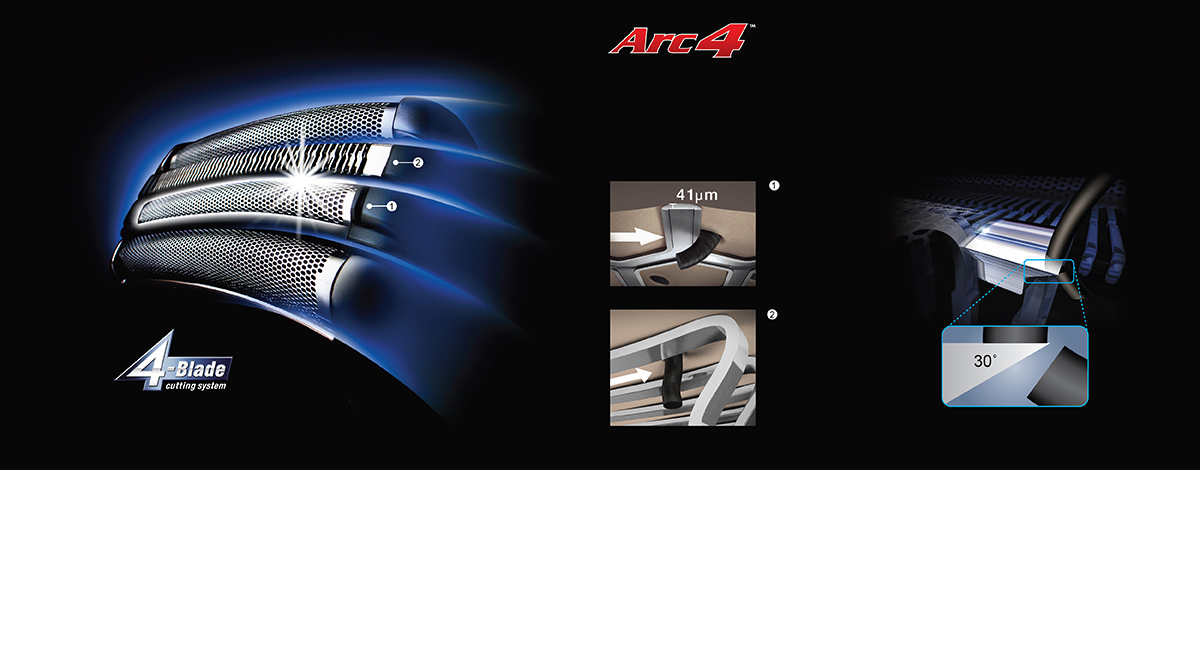Quatre grilles assurent un rasage en douceur et de très près, même sur les zones les plus difficiles de la barbe.
