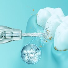 Avec jusqu’à 1 600 impulsions par minute et quatre niveaux d’intensité, le nouveau hydropulseur dentaire nomade Panasonic élimine les restes de nourriture, la plaque dentaire et les bactéries tenaces de la surface des dents, des espaces interdentaires et le long de la cavité gingivale. Il élimine même la « plaque flottante » des poches parodontales délicates. Il aide ainsi à éviter les processus inflammatoires qui peuvent entraîner une parodontite. Pour cela, l’EW-DJ4B est équipé d’une buse ultrasonique fine. Cette buse introduit des microbulles d'air dans le jet d’eau, qui en éclatant sur la surface des dents, produisent des ondes sonores. Ainsi, l'hydropulseur dentaire sans fil élimine les impuretés de manière particulièrement efficace et douce.