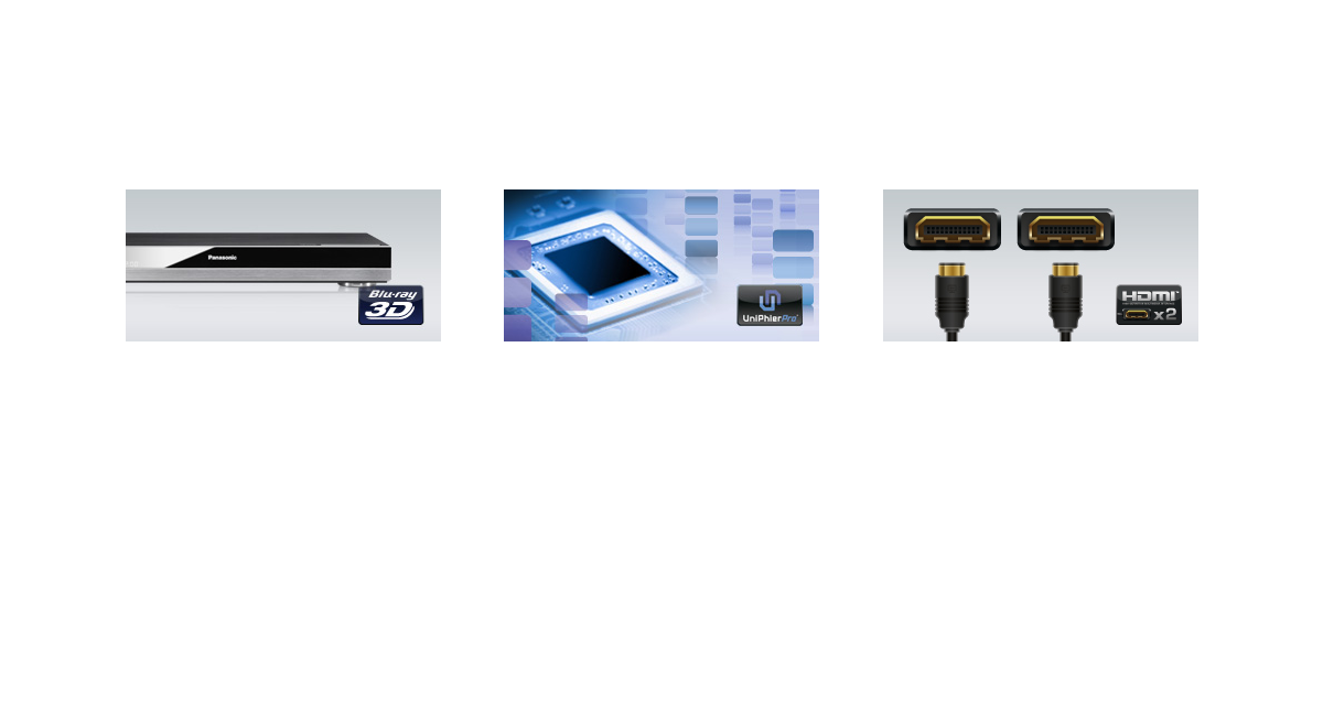 Sie lieben Filme und Ihr Herz schlägt für Musik? Der Premium Blu-ray Disc™ Player DMP-BDT500 teilt Ihre Leidenschaft. Für einen hohen Genussfaktor fährt Panasonic ausgesuchte Technik auf - stilsicher verpackt in einem Chassis mit markantem Hairline-Design und Aluminium-Front. Für eine blitzsaubere Bild- und Tonqualität sorgen u.a. der neueste Uniphier Pro² Prozessor und der 192 kHz/32 Bit Digital/Analog-Wandler von Burr Brown. Mit seiner 3D-Fähigkeit, der 2D-3D Konvertierung von zum Beispiel Blu-ray oder DVD sowie zwei HDMI-Ausgängen ist der DMP-BDT500 für modernstes Home Entertainment ausgelegt. Das HDMI-Doppel lässt Anschlussprobleme gar nicht erst aufkommen.