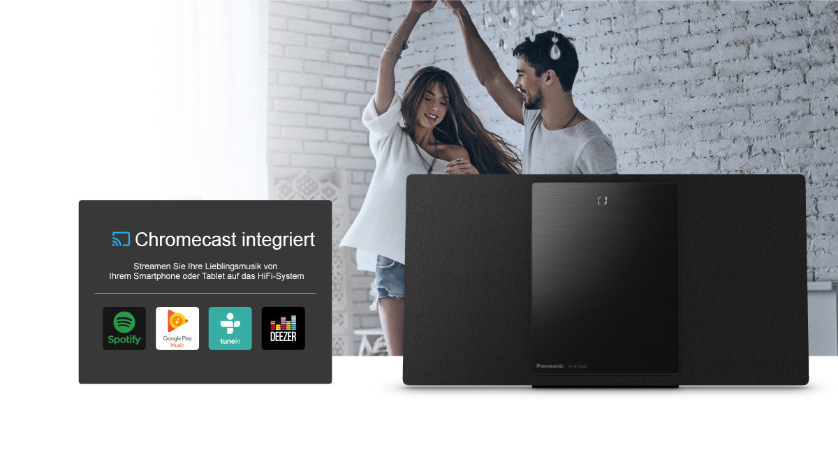 Genießen Sie wahlweise Ihre CD-Sammlung, Radio oder streamen Sie Ihre Lieblings-Musikdienste dank integriertem Chromecast built-in bequem vom Smartphone oder Tablet auf das Micro HiFi System SC-HC2040. Die elegante Kompaktanlage mit raumfüllendem Klang fügt sich perfekt in jeden Wohnstil ein.