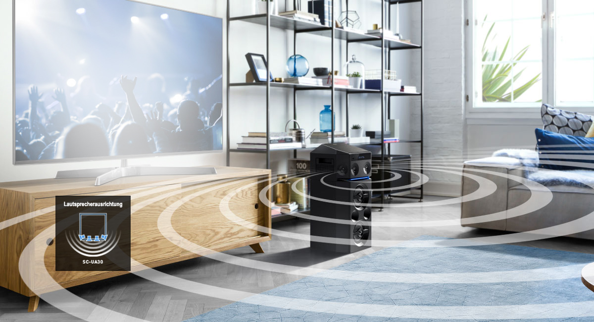 Erstaunlich klarer, dynamischer Klang im kompakten Design. Die SC-UA30 liefert raumfüllenden Sound für jeden Anlass. Singen Sie zusammen mit Ihren Freunden Karaoke oder spielen Sie dank UKW-Radio Tuner, Bluetooth, USB und AUX Ihre Lieblingssongs ganz einfach ab. Mit 300 Watt Ausgangsleistung und den seitlich abstrahlenden Lautsprechern erfüllt die Musikanlage wirklich jede Ecke Ihres Raumes!