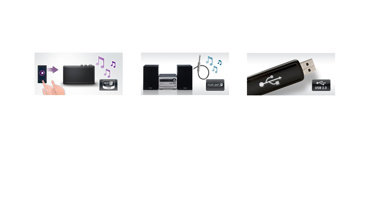 Panasonic Micro HiFi Anlagen sind äußerst anschlussfreudig – über den Musicport Audioeingang (3,5 mm) lassen sich im Handumdrehen mobile Abspielgeräte und oder sogar der Flachbildfernseher bequem per Kabel anschließen.