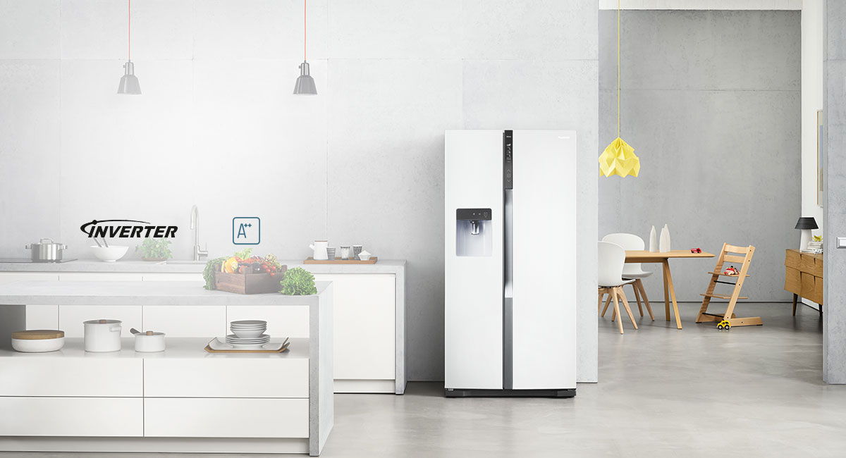 Eine neue Hauptattraktion für Ihre Küche. Halten Sie alle Lebensmittel griffbereit, wenn Sie sie benötigen. In diesem geräumigen Side-by-Side Kühlschrank mit einer Kapazität von 530 Litern ist für alles Platz. Er überzeugt durch ein attraktives Design. Er ist zudem effizient und steckt voller Technik, die für länger frische Lebensmittel und einen umweltfreundlichen Betrieb sorgt. Frische Ideen für frische Köpfe.