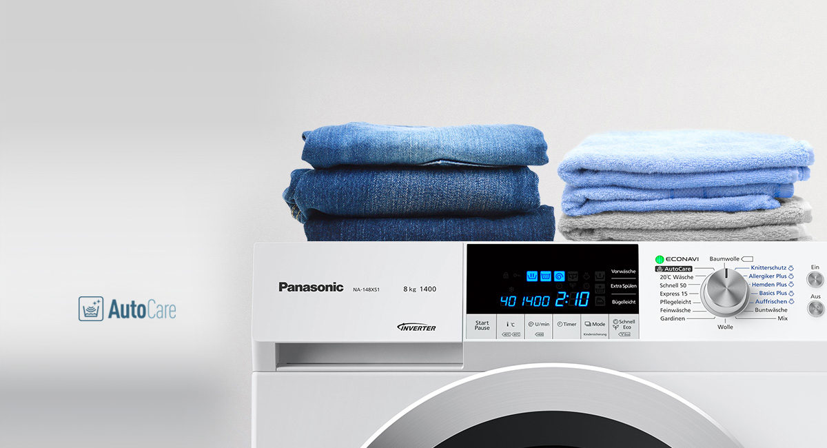 Die neue Panasonic NA-148XS1 Waschmaschine mit AutoCare sorgt für kompromisslos saubere Wäsche. Die AutoCare Funktion bedient sich der ECONAVI-Sensortechnologie, um den jeweiligen Verschmutzungsgrad der Wäsche zu ermitteln, und optimiert Wasserverbrauch, Temperatur, Waschdauer sowie Spül- und Schleuderzyklus für perfekte Ergebnisse bei jedem Waschgang.