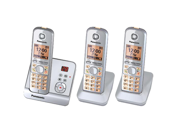 Das KX-TG6723 (mit 3 Mobilteilen) überzeugt durch seine neue Smart-Taste am Mobilteil und erstklassige Bedienerfreundlichkeit. Die Smart-Taste blinkt, wenn das Telefon klingelt, es etwas Neues auf dem Anrufbeantworter gibt oder Anrufe verpasst wurden. Ein Druck auf die Smart-Taste genügt, um Gespräche mit bereits aktivierter Freisprechfunktion anzunehmen oder den integrierten Wecker noch einmal für fünf Minuten zum Schweigen zu bringen. Komfort in die Bedienung bringt nicht nur das große 1,8 Zoll Punktmatrix-Display und die 4-Wege Navigation, sondern auch das neue Icon-basierte Menü. Die Symbole erlauben einen intuitiven Zugriff auf alle wichtigen Einstellungen und Funktionen.