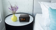 Wer das Smartphone aus dem Schlafzimmer verbannen möchte, startet mit dem UKW Radiowecker RC-800 in den Tag. Er verzichtet auf die Ladefunktion und unterscheidet sich äußerlich durch seine orangefarbene Displayanzeige vom RC-D8.
