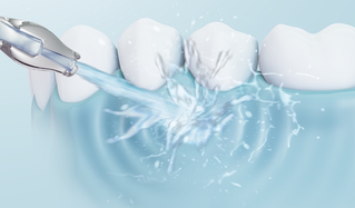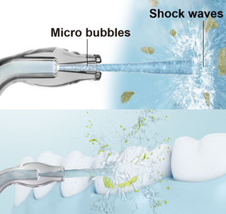 Panasonic combines its unique ultrasonic technology in the water jet to achieve cleaning of the tooth surface, which was impossible for conventional irrigators. The narrow nozzle increases water jet speed and microbubbles are generated. The shock waves generated when air bubbles burst amplify the cleaning power. This helps to remove more food debris on and between the teeth, even with the same level of water pressure.