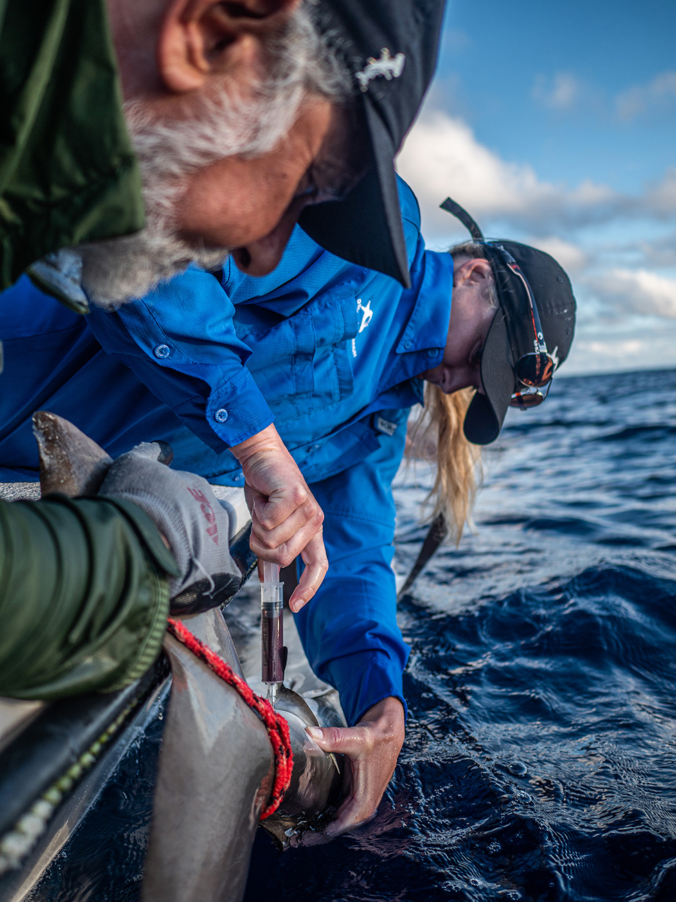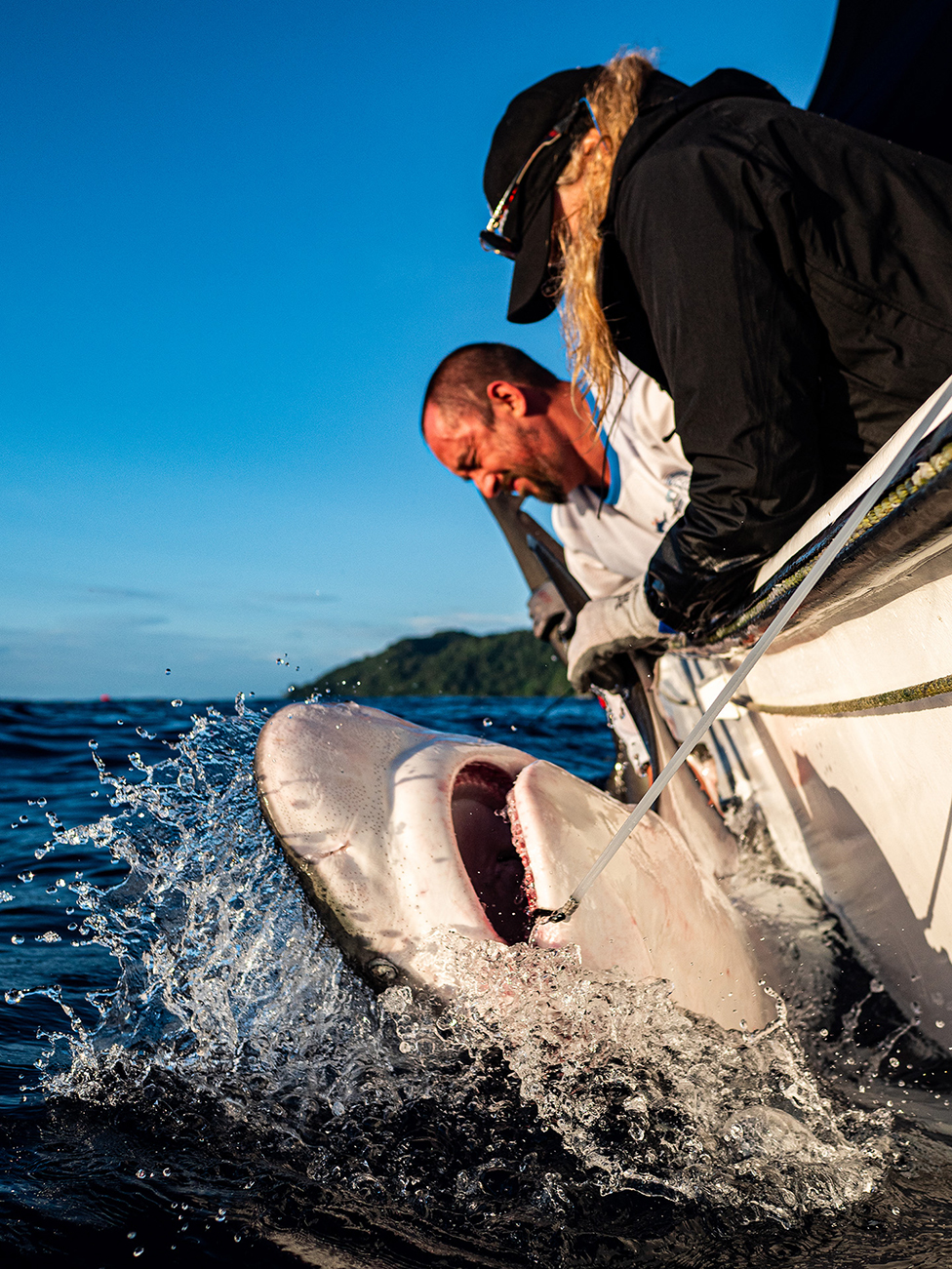 Haiden merkitsemistä varten niitä houkutellaan veren ja syöttien avulla. ”Merkitsimme hait paitsi veneestä myös vedessä. Se oli ensimmäinen kerta, kun sukelsin haiden kanssa vedessä, jossa oli runsaasti tuoretta verta. Vaikka ihmiset eivät ole tiikerihaiden ruokalistalla (yksi merkittävien lajien luettelossa), ne ehdottomasti ottavat miehestä mittaa. On jatkuvasti katsottava olkapään yli, kun ympärillä on lauma haita. Kuten isojen kissojen kohdalla, on näidenkin kanssa parasta säilyttää katsekontakti.” He myös merkitsivät vasarapäähaita. ”Meidän piti käyttää eri strategiaa. Meidän piti sukeltaa hyvin syvään, jopa 30 metriin, piiloutua kallioiden väliin ja lyödä haita juuri oikeaan aikaan erikoissuunnitellulla sauvalla, jota käytetään eräänlaisena harppuunana tunnisteiden kiinnittämiseksi selkäeviin. Se oli todella vaikeaa.” Suojelupyrkimysten dokumentointi oli toinen haaste, etenkin voimakkaiden merivirtojen takia. Joakim kuvasi vedenpinnan ylä- ja alapuolella luotettavalla LUMIX GH5 -kamerallaan. ”Kameran koon ja toimintojen vuoksi sitä on helppo käsitellä sekä vedessä että pinnan yläpuolella. Olen käyttänyt tätä kameraa useissa vedenalaisissa projekteissa, eikä se koskaan pettänyt minua. Käytin ylimääräistä näyttöä tässä projektissa, mikä helpotti oikeiden kulmien saamista.” Hän toivoo, että hänen elokuva auttaa haiden ja muiden meren eläimien suojelussa. 'Hait ovat valtamerten ravintoketjun huipulla. Niillä on tärkeä rooli merten ekosysteemien pitämisessä kurissa. He ovat ratkaisevassa asemassa valtamerten pelastamisessa."
