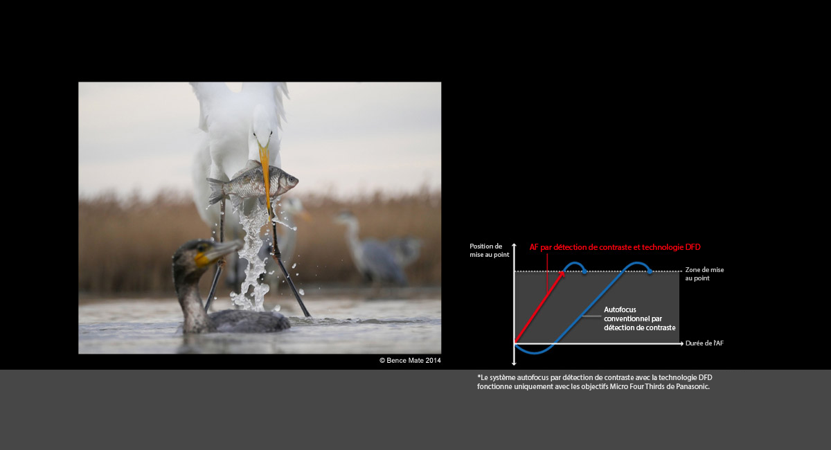 Le système autofocus par détection de contraste se perfectionne grâce à la technologie DFD (profondeur par défocalisation), qui réduit davantage le temps nécessaire à la mise au point. Il détermine la distance jusqu'au sujet, en analysant 2 images avec un niveau de netteté différent et en consultant les données des caractéristiques optiques de l'objectif utilisé, le tout en un instant. C'est ainsi que l'on obtient un AF ultra rapide d'env. 0,07 s.* Cette amélioration est plus avantageuse encore lorsque la longueur focale augmente.