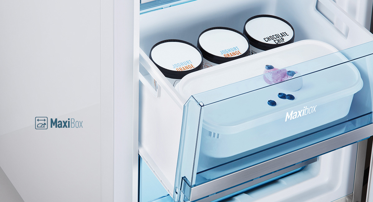 Les clayettes en verre trempé Slide’n’Store vous permettent d'agencer facilement l'espace dans votre réfrigérateur pour y placer des aliments de grande taille.