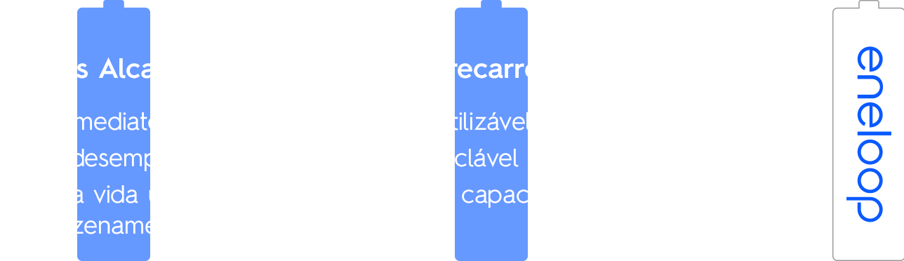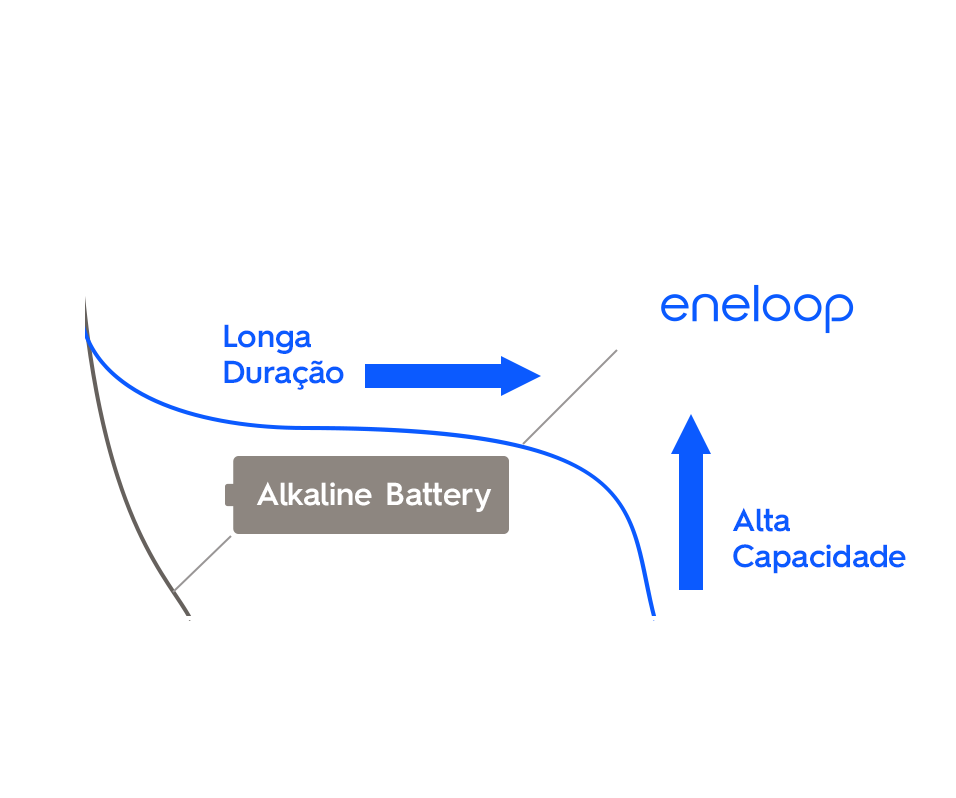 * Com base nos testes internos da Panasonic de eneloop de tamanho AA e pilhas alcalinas convencionais. Os resultados podem variar dependendo do equipamento utilizado e de outras condições.