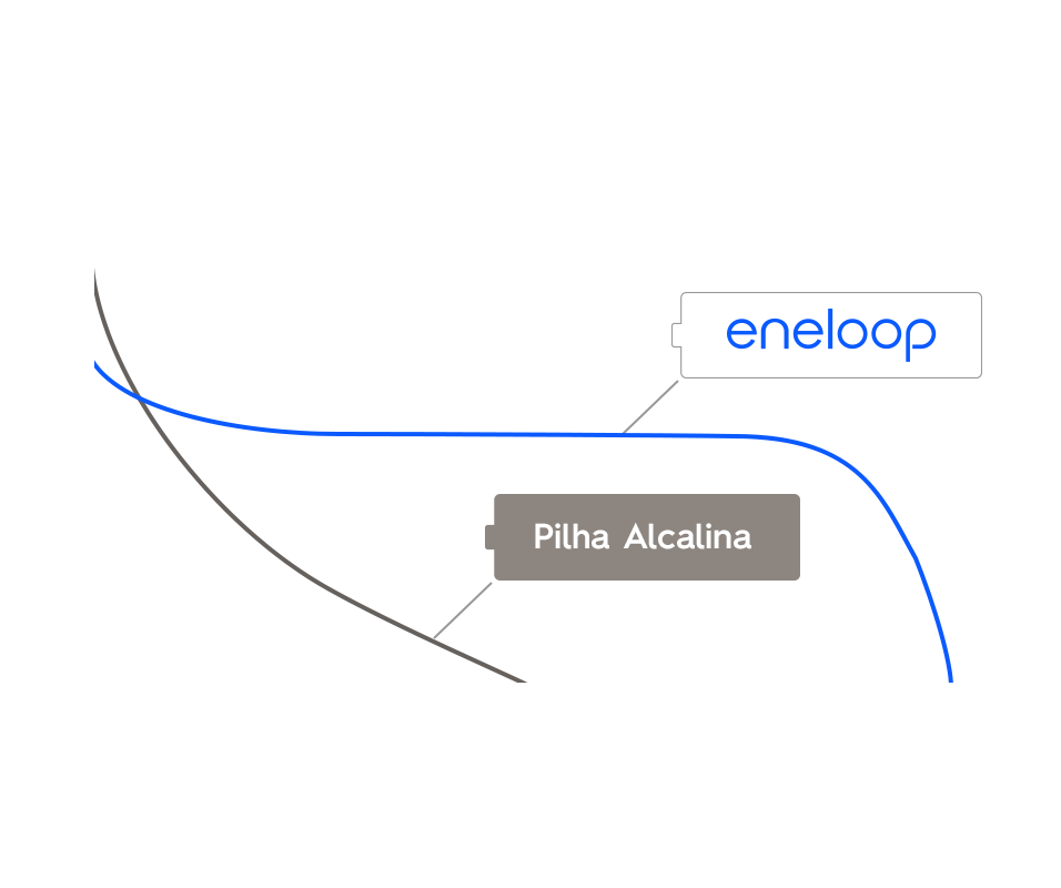 A tensão das pilhas eneloop flui de forma constante por mais tempo, até que a pilhas se esgote - isso significa que seus dispositivos funcionam de forma confiável e você usa aproveita muito a energia das suas pilhas.