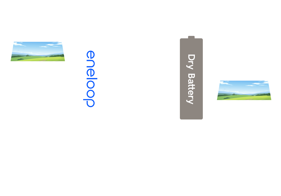 As pilhas eneloop são carregadas com energia solar da fábrica como parte da nossa participação no Sistema de Certificados Verdes e iniciativas da Panasonic Environment Vision 2050, onde a nossa empresa pretende gerar mais energia do que utilizamos até 2050. O pré-carregamento significa que você pode usar sua eneloop imediatamente após a compra.