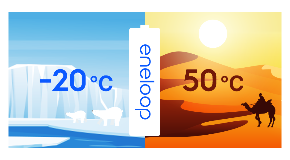 Todas as pilhas dependem de uma reação química para gerar energia, e as condições de congelamento podem retardar ou até mesmo parar essas reações. As pilhas eneloop são mais resistentes aos efeitos do frio e pode funcionar em temperaturas de aprox. -20 °C. Utilize-as em seus dispositivos com confiança!