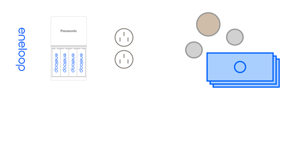 Por exemplo, alimentar um controle de vídeo game com eneloop é quase U$$ 20 por ano mais barato do que as pilhas convencionais. É fácil ver como as economias se somam se você mudar todos os seus dispositivos movidas a pilha para eneloop, já que você reutilizar suas pilhas por até 2.100 vezes*.