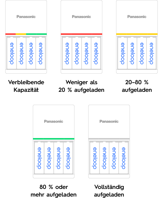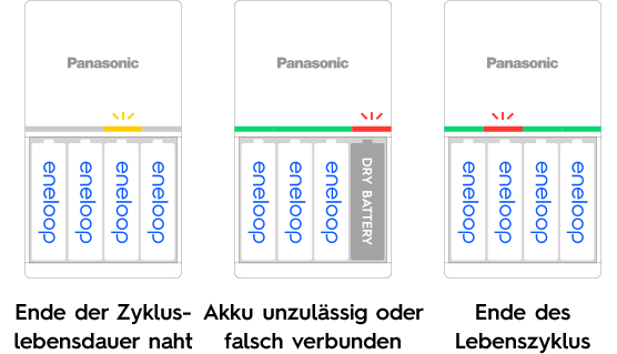 Die vier LED-Anzeigen über den Steckplätzen blinken etwa drei Sekunden lang von links nach rechts grün, während das Ladegerät den Akkustatus überprüft. Die verbleibende Kapazität jedes eingelegten Akkus wird dann separat mit drei verschiedenen Farben angezeigt (rot: weniger als 20 % geladen, gelb: 20–80 % aufgeladen, und grün: mehr als 80 % aufgeladen). Wenn sich ein Akku dem Ende seines Lebenszyklus nähert, blinkt die Leuchte über seinem Steckplatz gelb. Wenn ein Akku unzulässig ist oder falsch eingelegt wurde, blinkt die Leuchte über dem Steckplatz rot, und die Stromzufuhr zu diesem Steckplatz wird unterbrochen, um Schäden am Akku und Ladegerät zu vermeiden. Wenn der Akku kompatibel und korrekt eingelegt ist und die Leuchte rot blinkt, hat er das Ende seines Lebenszyklus erreicht und kann nicht geladen werden.