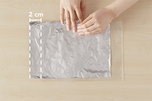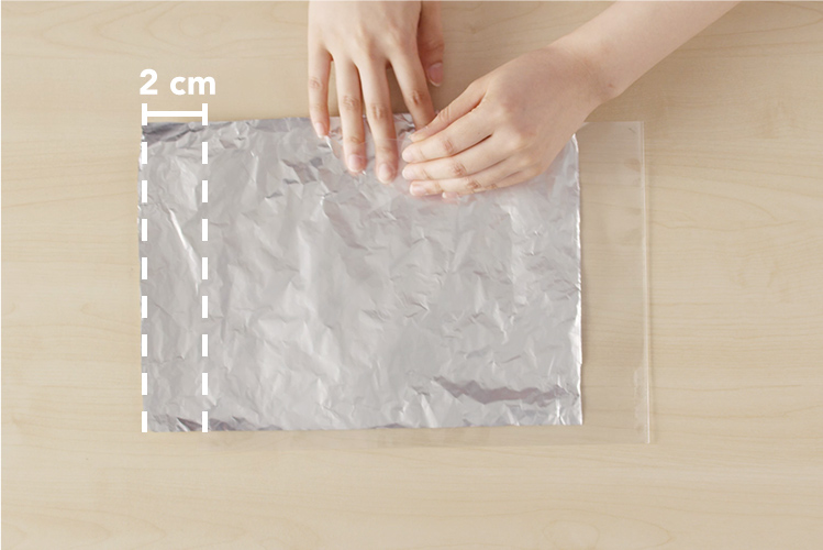 With the longer, open side of the folder facing towards you, insert a sheet of A-size foil in the same orientation as the folder (long side facing you). Position it so there’s about 2 cm of foil hanging out of the open top end of the file. Keep the foil’s long edge parallel to the long edge of the folder.